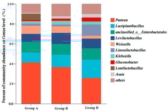 Figure 1 shows the abundances of the top 10 bacterial genera in the fermented corn straw. The dominant genera were Pantoea, Lactiplantibacillus, unclassified_o__Enterobacterales, Levilactobacillus, Weissella, and Limosilactobacillus. Compared with those in groups A and B, the relative abundances of Lactiplantibacillus and Limosilactobacillus were markedly higher, and the abundances of Pantoea and Weissella were lower in group D.