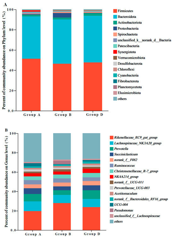 Figure 2A shows the ruminal abundances of the top 15 bacterial phyla in Hu sheep. The predominant phyla were Firmicutes and Bacteroidetes, followed by Actinobacteriota and Proteobacteria. The abundances of Proteobacteria in group B were higher than those in groups A and D. Compared with those in groups A and B, the abundances of Bacteroidetes and Actinobacteriota were significantly higher in group D.