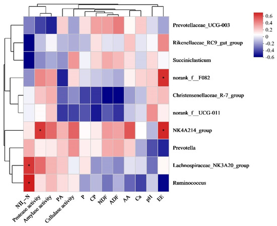 Correlation of ruminal bacterial abundances with environmental factors. Correlations in red and blue suggest positive and negative correlations, respectively. * p < 0.05. NH3-N, ammoniacal nitrogen; CP, crude protein; EE, ether extract; NDF, neutral detergent fiber; ADF, acid detergent fiber; AA, acetic acid; PA, propionic acid; Ca, calcium; P, phosphorus.