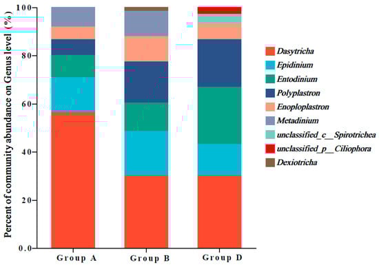 As shown in Figure 4, nine genera of ciliates were identified. The top five major ciliate genera were Dasytricha, Epidinium, Entodinium, Polyplastron, and Enoploplastron. The abundance of Dasytricha in group A was significantly higher than that in groups B and D. Compared with that in groups A and B, the abundance of Entodinium was significantly higher in group D. The abundance of Polyplastron in group D was markedly higher than that in group A. Compared with that in groups A and D, the abundance of Enoploplastron was significantly higher in group B.