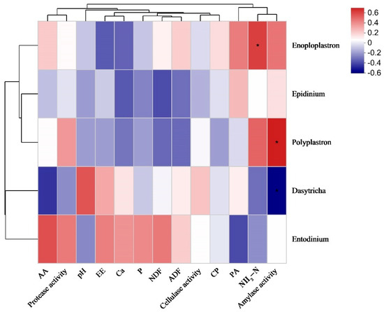 Correlation of ruminal ciliate abundances with environmental factors. Correlations in red and blue suggest positive and negative correlations, respectively. * p < 0.05. NH3-N, ammoniacal nitrogen; CP, crude protein; EE, ether extract; NDF, neutral detergent fiber; ADF, acid detergent fiber; AA, acetic acid; PA, propionic acid; Ca, calcium; P, phosphorus.