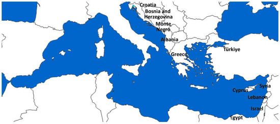 The Eastern Mediterranean (EM) area is characterised by hilly terrain and hot summers with irregular/small rainfall [1], which determines the habits of cheese-makers and the characteristics of the cheeses produced in this region. The EM borders three continents, including Africa, Asia, and Europe, and includes 11 countries (Egypt, Israel, Lebanon, Syria, Türkiye, Cyprus, Greece, Albania, Montenegro, Bosnia and Herzegovina, and Croatia; Figure 1).