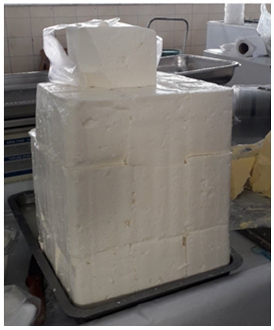 The draining and moulding of the curd is done by self-pressing or light pressing to shape the curd. Cutting the cheese into slices (in Greek, slice = feta) or cubes (Beyaz peynir cheese). Draining in (tied) cheese cloths to form a spherical cheese dough, lasting 6–8 h (Vlašićki sir). The formed cheese ball must be carefully removed from the cloth. Cutting the ball is quite unique. The ball must be cut in half, and then each half cut into three slices (Bosnian = kriška; [33]). The Turkish Beyaz peinir cheese is characterised by a cube shape of ≈10 cm × 10 cm × 10 cm (Figure 2).