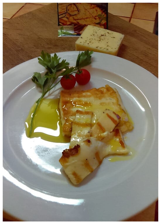 In the production of Halloumi cheese, the raw milk is curdled with animal rennet at 33–34 °C. The curd is then cut into 1 cm cubes, which are left to rest for around 10 min and scalded within 15 min at approximately 40 °C with constant stirring and passed into transferred to the hoops to drain, usually under pressure. The pressed curd is cut into pieces of 10 cm × 15 cm × 3 cm, placed in its own hot, deproteinised whey and heated to 90–95 °C for 30 min with stirring. The cooked curd is not stretched, as with typical pasta filata cheeses, but drained, cooled on a table, and sprinkled with salt or alternatively with crushed dry mint leaves (Mentha viridis) before being folded in half. Cheese is put into a container and the next day poured with salted whey and kept there for approximately 3 h. It can be packed in plastic bags and marketed immediately or preserved in brine till consumption [16,36]. This cheese is usually fried before consumption (Figure 3).