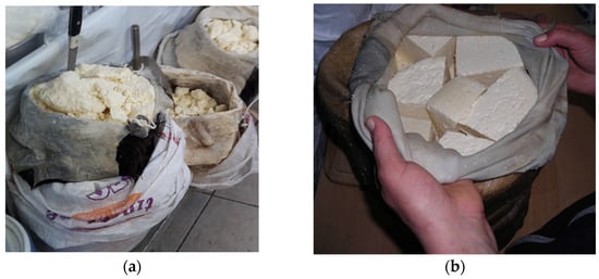 The curd of the Tulum cheese is cut into 1–3 cm3 cubes, and the cheese grains are heated at 30–35 °C/10–30 min or 50 °C/12–15 min and then harvested by hand. The cheese is wrapped in a cloth in which it is pressed, first by self-pressing and then twice under pressure. The Tulum cheese is also salted twice: I) dry in a cloth after the second pressing, II) after being broken by hand into small, irregularly shaped pieces after the third pressing [24]. The production process of Darfiyeh cheese is slightly different. After cutting the curd into medium-sized cubes, the curd grain is heated at 30–35 °C/20 min, compacted for the first drainage of the whey, pressed by hand into the 12 cm × 9 cm × 9 cm shape and then formed into cheese balls (400–500 g). It is not salted while it matures together with whey cheese Arichi, which is salted [20].