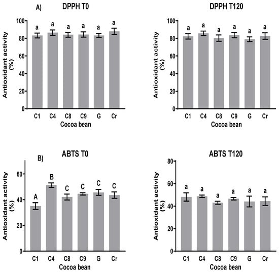 - Ramos-Escudero, F.; Casimiro-Gonzales, S.; Fernández-Prior, A.; Chávez, K.C.; Gómez-Mendoza, J.; de la Fuente-Carmelino, L.; Muñoz, A.M. Colour, Fatty Acids, Bioactive Compounds, and Total Antioxidant Capacity in Commercial Cocoa Beans (Theobroma Cacao L.). LWT Food Sci. Technol. 2021, 147, 111629. [Google Scholar] [CrossRef]