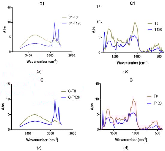 | Number of Wavenumbers | FTIR Range Peaks (cm−1) | Functional Groups | T0 Peaks | T120 Peaks |