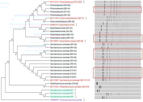 Genetic differences among yeast isolates were investigated using phylogenetics and in silico RFLP. In silico RFLP is important because it simulates restriction patterns generated by selected restriction enzymes, making it easier to compare different microbial isolates. Phylogenetic analysis and in silico RFLP-PCR indicate that there could be genetic differences between the same isolated species of S. cerevisiae and those of P. kudriavzevii (Figure 2). Samples containing only non-Saccharomyces yeast species were observed, and these include UK1 (K. humilis), ME1 (K. unispora), GT1 (P. kudriavzevii) and GA1 (P. kudriavzevii). These isolates are commonly found in sourdough, as reported in various studies [,,]. Furthermore, some samples exhibited co-occurrences, where more than one yeast species were present in a sample. These were FJ2 (S. cerevisiae and W. anomalus), GD1 (S. cerevisiae and P. kudriavzevii) and MN1 (S. cerevisiae and P. membranifaciens). All of these yeast species, including the non-conventional yeasts, are known to be involved in spontaneous fermentations of sourdough []. However, based on the 98.41% ITS sequence identity lower threshold established by Vu, Groenewald [], and since they are denoted as “aff” in Supplementary Materials Table S1, this indicates that there is a possibility of novel yeast strains isolated from traditional sourdough samples in Botswana (see Supplementary Materials Tables S5–S7 for more information).