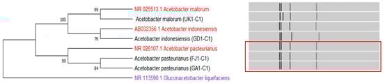 The AAB species clustered along with their type strains, indicating a close phylogenetic relationship. Out of the nine (9) samples, only three (3) isolates from three (3) samples were identified as AAB species. Acetobacter pasteurianus was the most frequently isolated species, as it was found in two samples (FJ1 and GA1). This study presents the genetic differences and similarities of the AAB isolated species and their LAB type strains (See Supplementary Materials Tables S11–S13 for more information). There are only minor genetic differences among the AAB, which may be due to the small sample size (see Figure 4). Therefore, the sample size may be too small to draw a definitive conclusion.