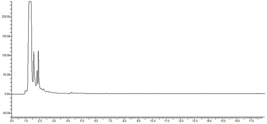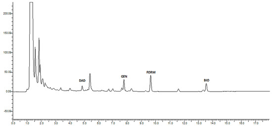 The next most significant isoflavone was genistein, with 2.997 µg/mL, followed by biochanin A (2.470 µg/mL). Genistein is reportedly the compound with the highest estrogenic activity on both estrogen receptors [66]. The lowest levels were determined for daidzein, at 1.411 µg/mL. The total amount of isoflavones in produced beer amounted to 12.214 µg/mL. Chromatograms of analyzed beers can be seen in Figure 1 and Figure 2.