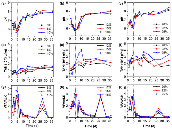 3.6. The Characteristics of pH, VFA/ALK, and TAN in the Fermentation Broth