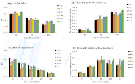 - Anagnostopoulos, D.A.; Kamilari, E.; Tsaltas, D. Evolution of bacterial communities, physicochemical changes and sensorial attributes of natural whole and cracked Picual table olives during spontaneous and inoculated fermentation. Front. Microbiol. 2020, 11, 1128. [Google Scholar] [CrossRef] [PubMed]