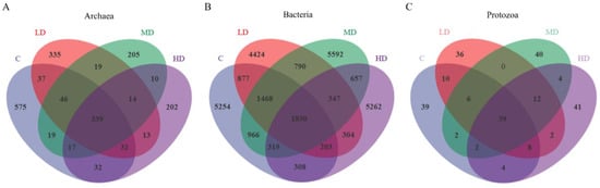 Venn diagram representation of the ASVs shared among all of the treatments. (A) Venn diagram plot of archaea; (B) Venn diagram plot of bacteria; and (C) Venn diagram plot of protozoa.