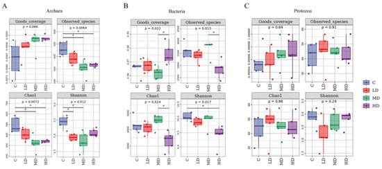 Boxplots of alpha-diversity indices (good coverage, observed species, Chao1, and Shannon) in different treatments. Individual samples in each treatment are represented by dots of different colors; * means significant differences between different treatments, significance was determined at p < 0.05. (A) Alpha-diversity of archaea; (B) Alpha-diversity of bacteria; and (C) Alpha-diversity of protozoa.