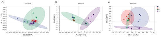 Principal coordinate analysis (PCoA) of the rumen microbiota based on Bray–Curtis distances; each dot represents an individual sample marked with different shapes and colors in different treatments. (A) PCoA of archaeal microbiota; (B) PCoA of bacterial microbiota; and (C) PCoA of protozoal microbiota.