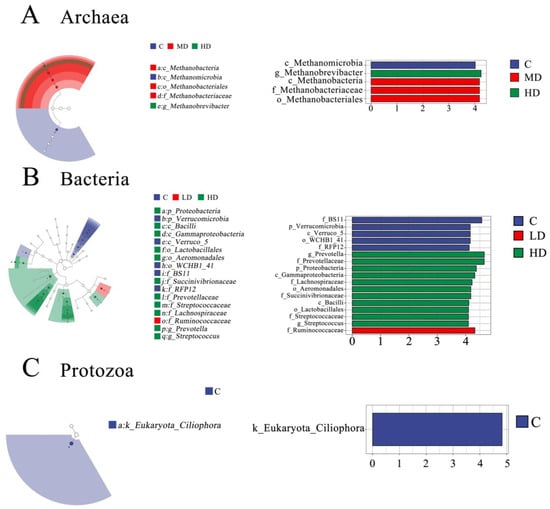 LEfSe identification of ruminal microbial biomarkers among the treatments. In the LEfSe taxonomic cladogram, circles radiating from inside to outside represent taxonomic levels from the phylum to the genus, respectively. Each small circle represents a classification at the respective taxonomic level. The diameter of a small circle is directly proportional to the relative abundance. Colorless hollow nodes indicate taxa that do not differ significantly between treatments, colored solid nodes indicate taxa that do differ significantly between corresponding treatments, and different colors represent different treatments. In addition, the horizontal coordinate of the linear discriminant analysis (LDA) distribution histogram indicates the LDA value, while the vertical coordinate indicates the marker taxon/taxa in each treatment. The higher the score, the better the corresponding marker taxon can discriminate between treatments (LDA scores > 2.0, p < 0.05). (A) LEfSe analysis of archaea; (B) LEfSe analysis of bacteria; and (C) LEfSe analysis of protozoa.