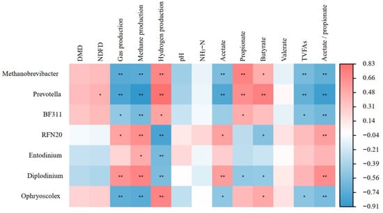 Heatmap of correlations between rumen microbiota and rumen fermentation characteristics (* mean p < 0.05, and ** mean p < 0.01).