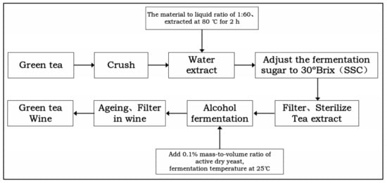 The main tea-producing areas of Hezhou Bapu District and Zhaoping County, China, provided the green tea (Table 1). White granulated sugar was produced by Nanning Sugar Industry Co., Nanning, China, and RW Commercial Yeast purchased from the Anchor Yeast Co., Yichang, China. Green tea and water were extracted at 80 °C for 2 h at material to liquid ratio of 1:60. The tea broth was applied as the fermentation base and pasteurized for 30 min after adjusting the sugar content (solid soluble content, SSC) to 30 °Brix. When the tea broth was cooled to room temperature (RT), 0.1% activated yeast was added and fermented at 25 °C []. The dry yeast was activated for 30 min with liquid fermented (37 °C) []. Fermentation was completed when the SSC remained unchanged, and the tea wine was centrifuged to remove the yeast for determination (Figure 1).