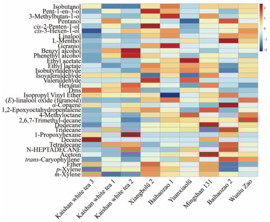 Tea aroma, the soul of tea, is one of the major factors contributing to tea quality and variety. This is mainly because the aroma can affect tea characteristics. The color of tea leaves, liquor color, and appearances of waste leaves were darker from green tea to black tea; meanwhile, the aroma became intensified due to the optimum oxidation of the leaf. Green tea tended to have a brisk taste, whereas oolong tea and black tea possessed asweeter taste, mainly due to glycoside degradation [,]. The volatile aroma of nine green tea samples are shown in Table 2 and Figure 2; the benzyl alcohol and phenethyl alcohol content in Kaishan white tea was higher than in other tea, with the benzyl alcohol content being up to two-fold higher, which indicated that this aroma substance could be used as a typical and unique aroma component of Kaishan white tea. Volatile compounds in tea produce the aroma. However, the aroma substances in tea are minimal, accounting for less than 0.1% of its total dry mass [,]. Moreover, a single sulfur-containing compound (dimethyl sulfide), which has a strong green tea aroma, has a high content of 12.94% in Kaisan white tea.