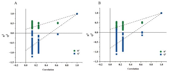 The results of the models constructed for all categories (Table 3) are based on the principle that R2and Q2 > 0.5 indicate an acceptable model [], and therefore only models for alcohols and alkanes could be used for the analysis of variance in this result, in which the independent variable fit indices (R2x) were 1 and 1, the dependent variable fit indices (R2y) were 0.997 and 0.998, and the model prediction indices (Q2) were 0.992 and 0.994, respectively. After 200 replacement tests, the intercept between the Q2 regression line and the vertical axis is less than zero, indicating that the model is not overfitted and showing the validated model (Figure 3). Therefore, the result of this research concluded that the modeling results could be significant for key aroma components in green tea.