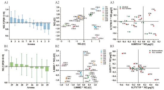 VIP value, scores and loading plots of OPLS-DA modelof Alcohol (A1–A3), VIP value plot, scores plot and loading plot of Alkane (B1–B3).