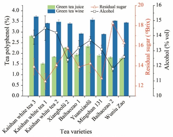 Comparison of quality differences between different varieties of green tea juice and wine. Columnar, Tea polyphenols; Triangles, Residual sugar; Square-shaped, Alcohol.