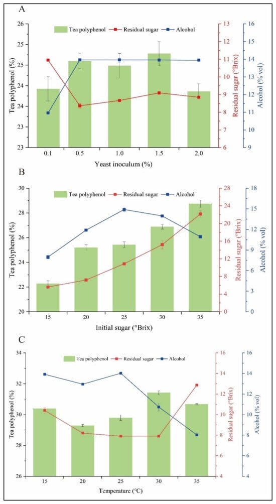 Temperature is one of the most important factors affecting the growth and metabolic efficiency of yeast. Within the optimal temperature range, the growth rate and metabolic capacity of yeast are positively correlated with temperature. When the temperature is higher than optimal temperature, yeast cells find it difficult to resist the extreme environment and irreversible damage occurs, leading to the decline of cell function or cell death [,]. Inoculum is a factor that affects the growth rate of microorganisms, and low inoculum will prolong the lag period. Within a certain range, an appropriate increase in the inoculum amount can promote the growth and metabolism of microorganisms. However, higher inoculum is not better, and too high inoculum will lead to an increase in secondary metabolites and premature death of microorganisms [,]. Yeast needs nutrients to grow, and tea juice is extremely low in carbon and nitrogen, failing to match the growth needs of the yeast growth. Sugar source acts as precursor for alcohol synthesis and determine the alcoholic yield, while providing a carbon source for yeast growth and facilitating the fermentation process [].