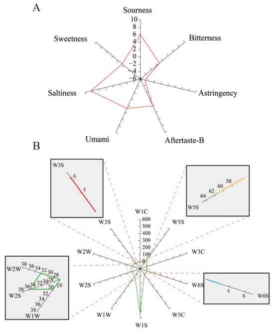 As shown in Figure 7B, the aroma components are mainly alkanes (W1S, W3S), nitrogen oxides (W5S), alcohols aldehydes and ketones (W2S) and sulfur-containing compounds (W1W, W2W). Based on G/G0, the order of aroma contribution can be seen as W1S > W5S > W2S > W2W > W1W > W3S > W6S. PLSR analysis of the aroma components along with the e-nose results showed that all the aroma components were positively correlated with the W5S, W1S and W1W sensors (Figure 8). This includes the hydrocarbon (W1S), which has the highest contribution value, with correlated aroma components 23–30.The dimethyl sulfur of the green tea aroma belongs to sulfide (W1W), which was consistent with the results of the e-nose. Aroma and taste together determine the flavor quality of tea and are dependent on volatile and non-volatile compounds. The contribution of a particular volatile compound to the tea aroma profile depends not only on its content but also on its odor activity value (OAV) and/or flavor dilution (FD) factor [,,,]. Technologies such as E-nose and E-tongue have been synthesized to discriminate sensory attributes of green tea during fermentation. The VOCs, not only serve as a homeostatic marker for plant homeopathic and environmental microorganisms, but also find utility in quality assessment and origin identification [,].