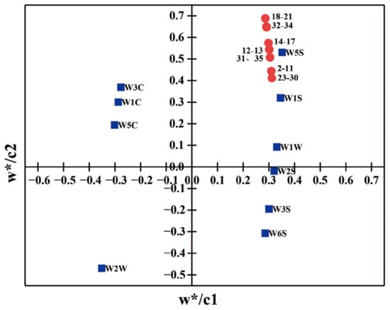 PLSR analysis of aroma and electronic nose. Solid red circles represent aroma components, and the blue squares represent the e-nose sensors, “w*” indicates the projection coefficient of the independent variable on the X axis (w*/c1) and the projection coefficient of the dependent variable on the Y axis (w*/c2) in PLSR analysis.