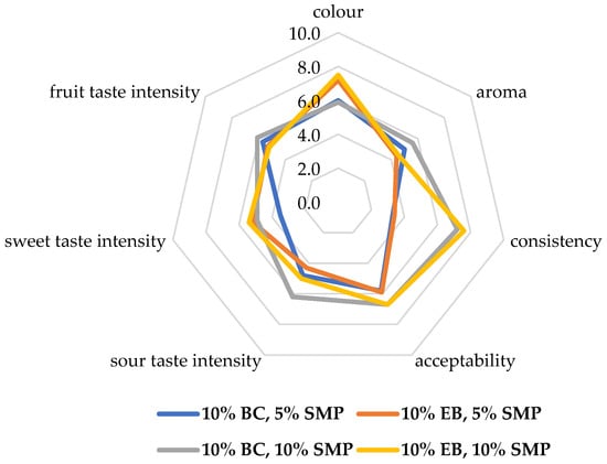 In the sensory analysis, the experienced assessors also noted differences in color between BC and EB yogurt, although the differences were not statistically significant (Figure 1). As reported by Raikos et al. [27] and Cais-Sokolinska and Walkowiak-Tomczak [29], the color of yogurt is significantly affected by the content of anthocyanins, which was also confirmed in our study, as the contents of anthocyanins in BC and EB differed significantly (Table 5). The assessors also noted differences in the intensity of sour taste (p = 0.0414) and sweet taste (p = 0.0449) when they rated EB yogurt (with 5 and 10% SMP) as the sweetest yogurt and BC yogurt (with 5% SMP) as the sourest yogurt. Logically, the assessors noted the most significant differences in consistency (p < 0.001), in which yogurt with 10% SMP was evaluated as the yogurt with the highest density.