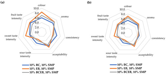 In Experiment 3, sensory evaluation was performed by two panels: experienced and trained (Figure 2a,b). EB yogurt was evaluated as the yogurt with the most acceptable color. In both groups of assessors, statistically significant differences were noted in color. Both groups similarly evaluated the difference in the sweet taste intensity (p < 0.001), and the EB yogurt was evaluated as the sweetest. Trained assessors evaluated the EB yogurt as the yogurt with the most pleasant taste (p = 0.0494). The sour taste intensity was perceived significantly by the trained assessors compared with the experienced assessors (p < 0.001); however, both groups evaluated BC yogurt as the sourest. The experienced assessors noted significant differences in consistency (p = 0.0224) and determined that the BC yogurt had the highest density.