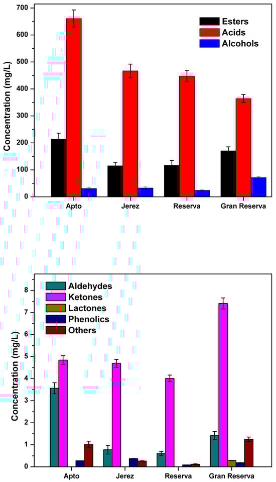 As a result, the total content of volatile compounds exhibited a decreasing trend in the range of 915.72 to 616.60 mg/L from the Apto to Gran Reserva samples. This decline is indicative of various processes such as oxidation, esterification, wood extraction, hydrolysis, and fermentation playing a significant role during this period. In a previous study by Morales et al. [], 18 volatile compounds were identified in Sherry wine vinegars aged up to 24 months using gas chromatography coupled with a flame ionization detector (GC-FID). In the current study, the GC-HSPME fiber method was utilized, enabling the capture and identification of even minor volatile components in all samples.