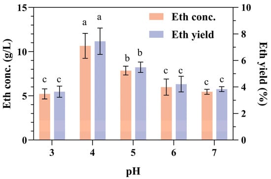 Effect of initial pH on ethanol production and yield from SPR fermentation. Error bars represent the standard deviation from the mean of three replicates. Letters a–c: Significant difference in relation to ethanol concentration or ethanol yield in pH 4.0 (p < 0.01).