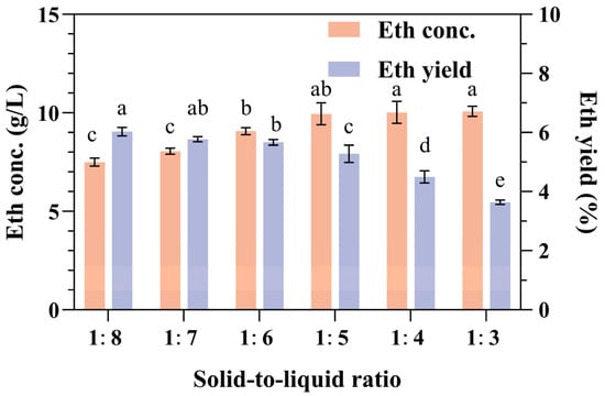 Effects of the solid-to-liquid ratio on ethanol production and yield from SPR fermentation. Error bars represent the standard deviation from the mean of three replicates. Letters a–e: Significant difference in relation to ethanol concentration in solid-to-liquid ratio of 1:3 or ethanol yield in solid-to-liquid ratio of 1:8 (p < 0.01).