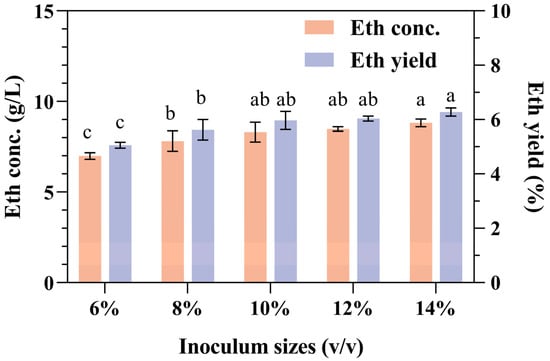 Effects of inoculation volume on ethanol production and yield from SPR fermentation. Error bars represent the standard deviation from the mean of three replicates. Letters a–c: Significant difference in relation to ethanol concentration or ethanol yield in inoculum size of 10% (p < 0.01).