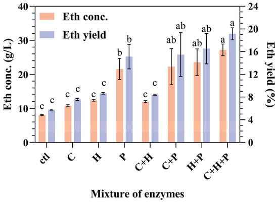 Impact of both combined and individual additions of cellulase, hemicellulase, and pectinase on ethanol production and yield during the CBP fermentation of SPR by strain 1974-GA-temA. Error bars represent the standard deviation from the mean of three replicates. Letters a–c: Significant difference in relation to ethanol concentration or ethanol yield in condition of C + H + P (p < 0.01). ctl: without enzyme addition; C: cellulase; H: hemicellulase; P: pectinase.