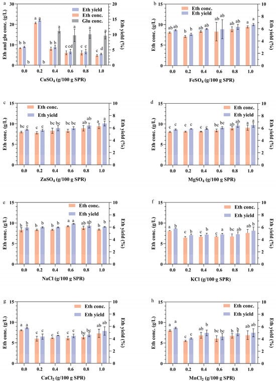 Impact of metal ions on the production of ethanol from the CBP fermentation of SPR by strain 1974-GA-temA. The influence of CuSO4 (a), FeSO4 (b), ZnSO4 (c), MgSO4 (d), NaCl (e), KCl (f), CaCl2 (g), and MnCl2 (h) were shown. Error bars represent the standard deviation from the mean of three replicates. The letters on the bar graphs represent the results of significance analyses (p < 0.01).