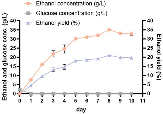 During fermentation, samples were taken every day for ethanol and glucose analysis. The ethanol and glucose concentrations were determined via a refractive index detector on an LC-2030C HPLC with a Bio-Rad HPX-87H column. The column was eluted at 65 °C with 5 mM sulfuric acid at a flow rate of 0.6 mL/min []. Ethanol productivity, ethanol yield from SPR, and estimated ethanol yield from glucose were calculated as previously described [,,].