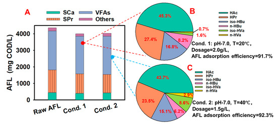 To make clear whether the preferable carbon sources (mainly SCFAs) were adsorbed by the MSEP, a carbon balance before and after adsorption under optimal adsorption conditions is depicted in Figure 2. As demonstrated in Figure 2A, the highest adsorption efficiency of 92.3% was obtained under condition 1 (40 °C, initial AFL 2300 mg COD/L, central pH value, and MSEP dosage 1.5 g/L). Of the total, 97.8% of the SCFAs in the raw AFL was adsorbed, also with 81.7% SPr and 95.4% SCa. More elaborately (Figure 2C), the SCFAs adsorbed on the MSEP included 43.7% HAc and 23.5% HPr with a lower proportion of other fatty acids, suggesting its capacity as an excellent carrier for an easily utilized carbon source. By contrast, with a moderate temperature of 20 °C and a higher MSEP dosage of 2 g/L, considerable SCFAs (96.2%) could also be conserved in the MSEP with an adsorption efficiency of 91.7%, although 6.3% less SCr was obtained. This high selectivity of SCFAs by the MSEP from the raw AFL could maximize the proportion of easily biodegradable organic carbons available for denitrification. Given that the sepiolite is easily available at a low cost, it is worthwhile to use more MSEP for the SCFA loss of less than 1%. Namely, compared to the higher energy input to raise the temperature to 40 °C (condition 2), it may be preferable to choose condition 1 as the optimal condition in terms of economic cost in actual applications (the samples and data were used for the following analysis and evaluation).