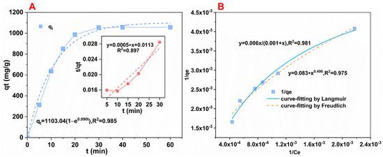 Curve fitting of the adsorption procedure: (A) kinetic fitting (the blue and red line for pseudo-first-order and pseudo-second-order model, respectively); (B) isotherm fitting (the blue and red line for Langmuir and Freudlich model, respectively).