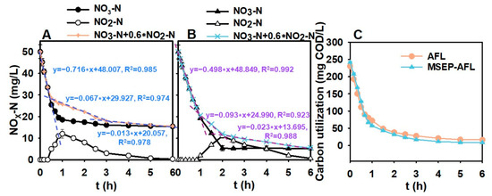 Performance of nitrate utilization of MSEP-AFL: (A) AFL and (B) MSEP-AFL NOX-N changes and the curve fitting of the denitrification rate; (C) COD utilization of AFL and MSEP-AFL during the denitrification process.