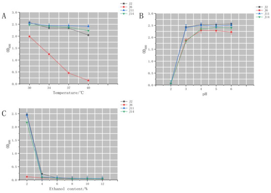 Fermented grains are the main carrier substrate for baijiu fermentation, and their microenvironment is characterized by high ethanol concentration, high temperature and low pH. Therefore, the screened high-yielding ethyl acetate yeasts need to be examined for acid, temperature and alcohol resistance to achieve the selection of suitable strains for this purpose. As can be seen from Figure 2A–C, low pH, high alcohol content, and high temperature inhibited the growth of J2, J6, J11, J14. Except for J6, which was less tolerant, the growth trends of the three plants were similar, but the ethyl acetate production capacity of J2 (1.198 ± 0.36 g/L) was much higher than that of J11 (0.641 ± 0.05 g/L) and J14 (0.575 ± 0.24 g/L). J2 was selected for the subsequent study.