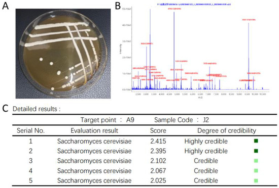 From Figure 3A of the J2 colony, it can be seen that the J2 colony is creamy white, with neat edges, uniform colony texture, and positive and negative sides, and the surface of the colony is moist, smooth, sticky and easy to pick up, which is in line with the basic morphological characteristics of yeast colonies. The strain was identified by MALDI-TOF-MS, and the preliminary identification result of the strain was Saccharomyces cerevisiae, as shown in Figure 3B,C.