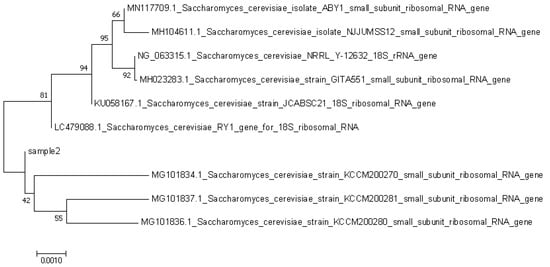 J2 was subjected to 26srDNA sequencing, and the results obtained from sequencing were subjected to blast sequence comparison in NCBI. Then, the phylogenetic tree of yeast strains related to the J2 gene sequence of Saccharomyces cerevisiae strains was plotted using MEGA-X software. As shown in Figure 4, the phylogenetic tree in the figure showed that strain J2 and Saccharomyces cerevisiae clustered on a branch and were close relatives of each other. Combined with the analysis of colony shapes and MALDI-TOF-MS measurement results, strain J2 was identified as belonging to Saccharomyces cerevisiae.