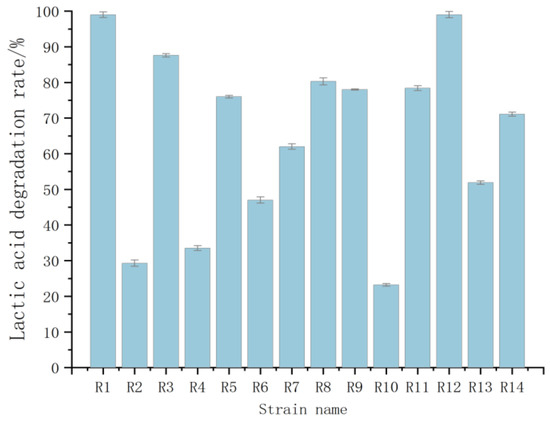 A total of 14 strains of bacteria were isolated and purified from the fermented grains using a sodium lactate solid medium. After the activation of the 14 strains of bacteria obtained from the isolation and purification, they were inoculated into the liquid fermentation of sodium lactate, and the fermentation products were processed by centrifugation and filtration through microporous filtration membranes to determine the lactic acid content by using high-performance liquid chromatography (HPLC), and to calculate their lactic acid degradation rate. The final results of the assay are shown in Figure 5, which indicate that these 14 strains have the ability to degrade lactic acid, among which the degradation rates of R1, R3, R8, and R12 exceeded 80%, and the lactic acid degradation rates of R1 and R12 reached almost 100%. Therefore, these four strains were selected for the subsequent tolerance study.