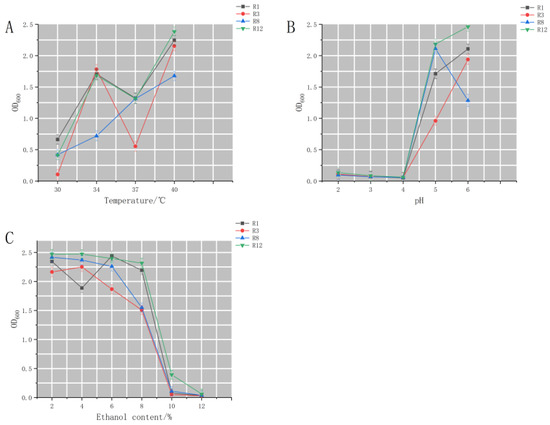 The same pH, alcohol concentration, and temperature tolerance experiments were performed on the four bacteria mentioned above with lactic acid degradation rates greater than 80%. From Figure 6A–C, it can be seen that low pH, high alcohol content, and low temperature all inhibited the growth of R1, R3, R8, and R12. However, overall, R12 always maintained high activity regardless of changes in environmental conditions, so R12 was selected for subsequent studies.
