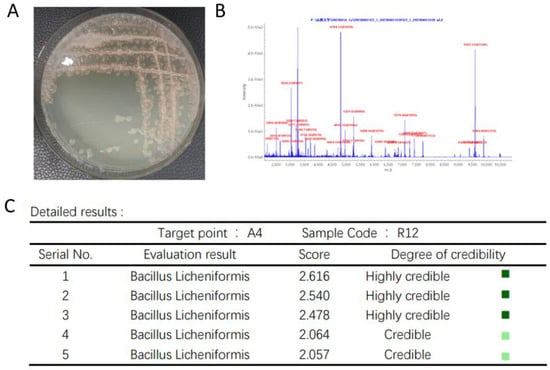 From Figure 7A, the single colony of R12 was small and irregularly shaped with untidy edges, and the strain was identified by MALDI-TOF-MS. From Figure 7B,C, the preliminary results of the strain were identified as Bacillus licheniformis.