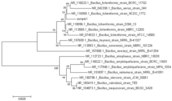 R12 was subjected to 16S rRNA sequencing, and the results obtained from sequencing were subjected to blast sequence comparison in NCBI. Then, the phylogenetic tree of the strains related to the R12 gene sequence of strain R12 was drawn using MEGA-X software. As shown in Figure 8, the phylogenetic tree in the figure showed that strains R12 and Bacillus licheniformis clustered on a branch and were close relatives of each other. Combined with the analysis of colony shapes and MALDI-TOF-MS measurement results, strain J2 was identified as belonging to Bacillus licheniformis.