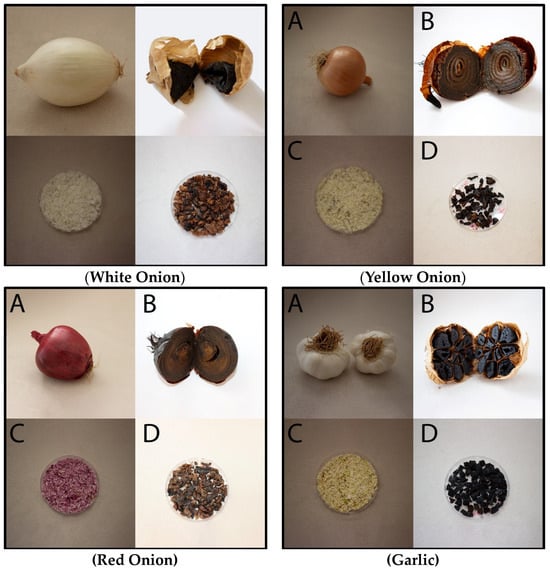 Onion and garlic samples were fermented at 75 °C and high humidity for 9–12 days without adding exogenous microorganisms, and their colors turned brown/black. Photographs of onion and garlic samples after fermentation are shown in the figure below (Figure 1).