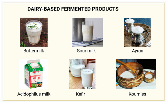- Kaur, H.; Kaur, G.; Ali, S.A. Dairy-Based Probiotic-Fermented Functional Foods: An Update on Their Health-Promoting Properties. Fermentation 2022, 8, 425. [Google Scholar] [CrossRef]